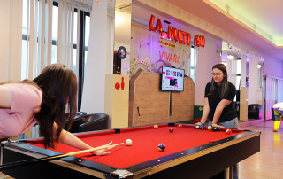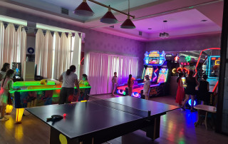 • Adulții se pot distra alături de copii la diverse echipamente de joacă, precum consolele PlayStation, air hockey, mesele de billiard, masa de tenis, minibowling cu două piste, basketball machine și bineînțeles, participarea pe ringul de dans și la karaoke.